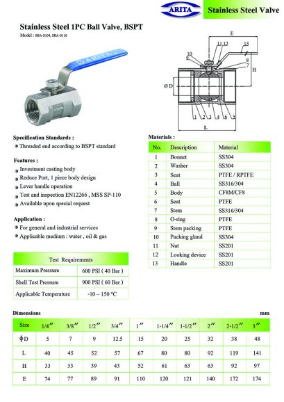 ARITA Stainless Steel 2PC Ball Valve, BSPT