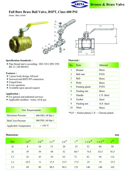 บอลวาล์วแบบสองชิ้น full port รุ่น AF600, เกลียว BSPT, Class 600 psi เหมาะสำหรับงานระบบน้ำประปา และ อุตสาหกรรมทั่วไป