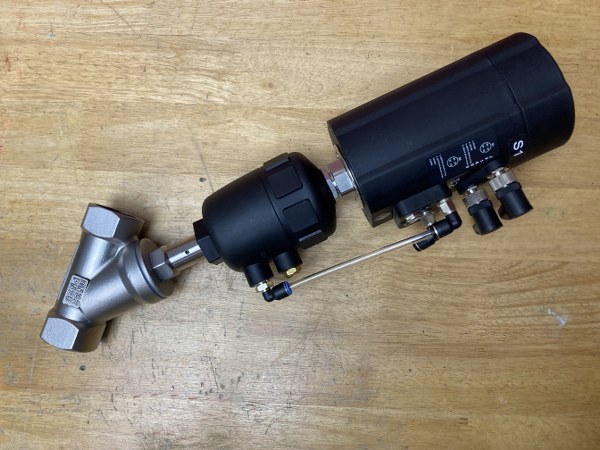 Pneumatic Angle seat valve + Electro-pneumatic positioner. Signal 4-20mA, feedback voltage 24VDC. Valve stainless steel 316L Port is DN32(1 1/4”)