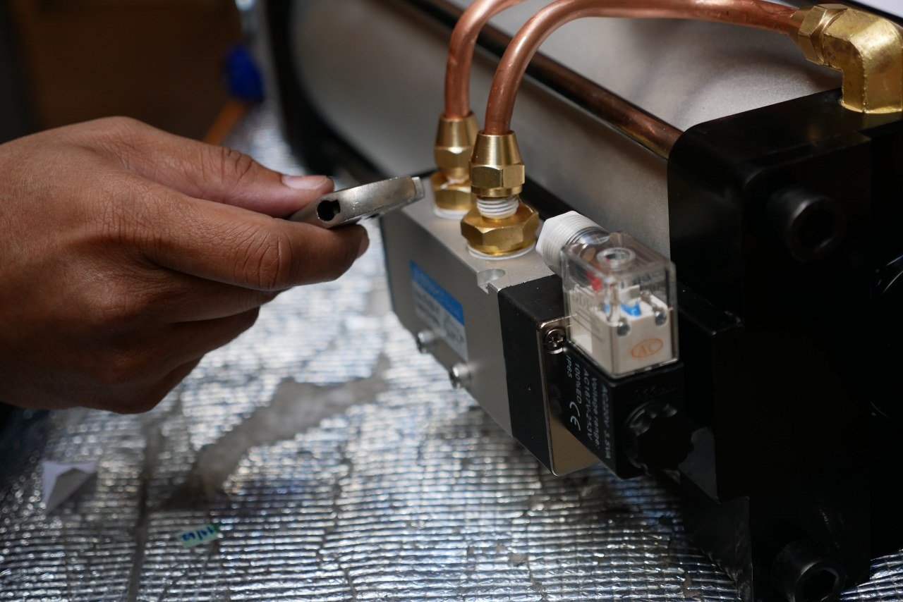 สวยงานเรียบร้อย กระบอกนิวเมติก ใช้ท่อทองแดง copper coil มาแทนสายลมในการทำงานครับ |