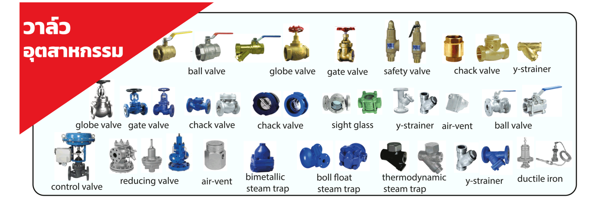 วาล์วเป็นเพียงส่วนประกอบหนึ่งในระบบส่งจ่ายวัสดุ ที่เราคุ้นเคยมากที่สุดคือน้ำ นั้นเองไม่ว่าจะเป็นในระบบอุตาหกรรมหรือตามบ้านเราจะคุ้นเคยกับวาล์วแทบทั้งนั้น เพราะฉะนั้นการทำความรู้จักกับชนิดของวาล์วจึงจำเป็นมาก และพอที่จะสรุปหน้าที่ของวาล์วในแต่ละแบบได้ดังนี้ ( วาล์วยังสามารถเปิด/ปิด หรือควบคุมอัตราการไหล สิ่งของที่ไม่ใช้น้ำได้อีกด้วยเช่น ใช้เปิด/ปิดลม / แป้ง / ฝุ่น /ผง ปูนซีเมนต์ / สารเคมีต่างๆ เป็นต้น