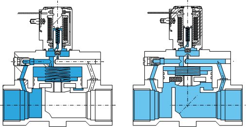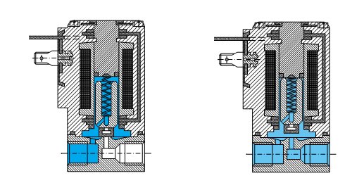 โครงสร้างการทำงาน จะอาศัยแรงจาก coil ดึงแกนอาเมเจอร์ ขึ้นน้ำหรือลมที่เราต้องการเปิด/ปิด จะไหลผ่านไปได้ ลักษณะแบบนี้เราเรียกว่าวาล์ว 2/2 แบบเปิดและปิดโดยตรง  (Direct operated)  หรือจะสังเกตได้อย่างไรว่า valve ตัวไหนเป็น แบบ Direct operated คือให้ดูที่ แคตตาล็อกหรือสเปกวาล์ว ที่ระบุช่วงแรงดันทำงาน หรือ Working pressuer จะต้องเริ่มจากแรงดัน 0 เสมอ เช่น Working pressuer = 0 to 7 Bar เป็นต้น