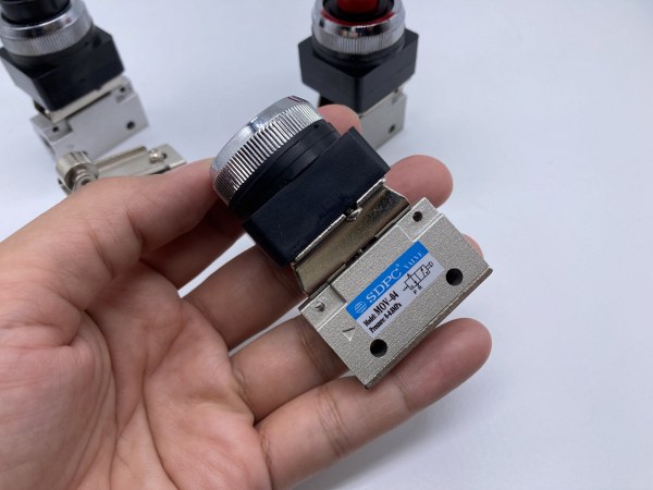 MOV04 Push button pneumatic valve 3/2 แบบกดติด ปล่อยดับ เมื่อมีการกด Push button Switch หน้าสัมผัสดังกล่าวจะเปลี่ยนสถานะ จาก NO เป็น NC หรือ จาก NC จะเป็น NO แต่เมื่อปล่อยมือออกจาก Push button Switch หน้าสัมผัสจะกลับสู้สภาวะปกติในแหน่งเดิมโดยมีแรงผลักดันจากสปริงให้ Push button Switchเข้าสู้สภาวะปกติ