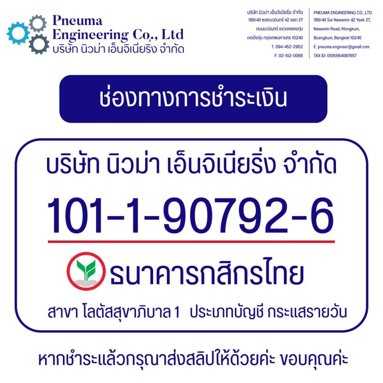 บริษัท นิวม่า เอ็นจิเนียริ่ง จำกัด21/13 ซอย นวลจันทร์52 ถนนนวลจันทร์ แขวงนวลจันทร์ เขตบึงกุ่ม กรุงเทพฯ 10230เบอร์ติดต่อ : โทร 094-452-2952เลขประจำตัวผู้เสียภาษี: 0105564087657