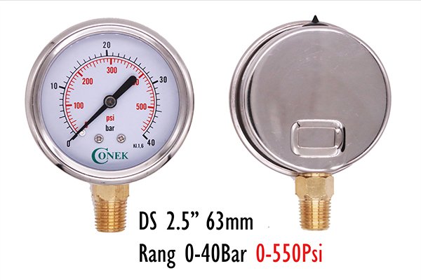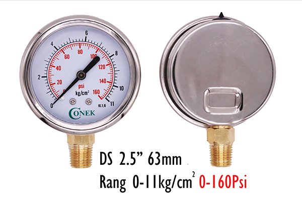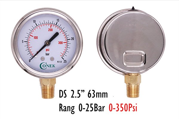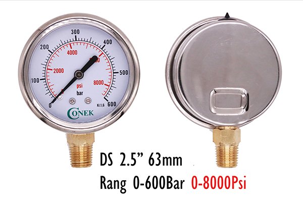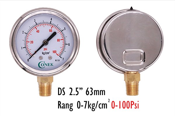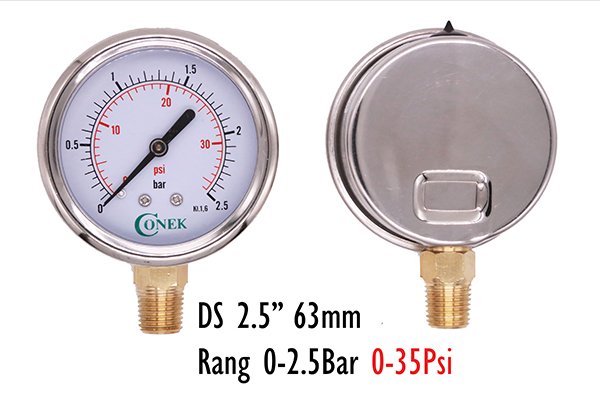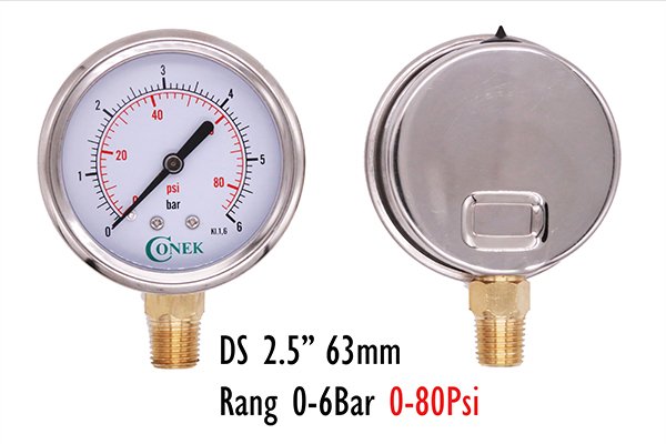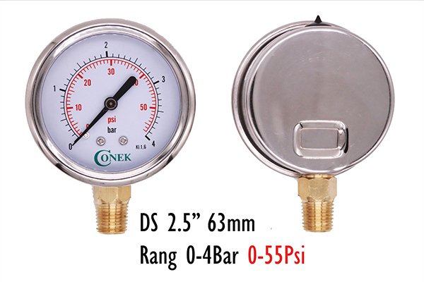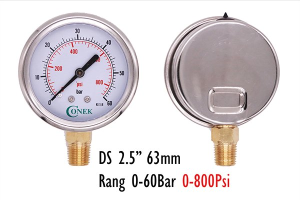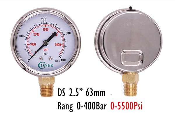 จำหน่าย Pressure gauge CONEK ผลิตจาก case AISI 304st.st ขนาดหน้าป้ัด 2.5" (63mm) เกลียว NPT/BSPT มี Scalesให้เลือกทั้ง bar , psi , kg/cm2 ภายในตัวสามารถเติม Glycerin ได้ เลือกใช้วัดความดันได้ตั้งแต่ 0 bar .... 600 bar หรือ 0 psi... 8700psi ตามความต้องการ....เหมาะกับงานอุตสาหกรรมทุกชนิดเช่น อุตสาหกรรมอาหาร,เคมี,พลาสติก ใช้วัดแรงดันน้ำ,แก๊ส,ลม,น้ำมัน(Hydraulic)สินค้าผลิตจากประเทศอิตาลี pressure gauge ทุกชิ้นมีรับประกัน Dial size 2.5 inches Bottom NPT/BSPT Brass 1/4 (in option Stainless)